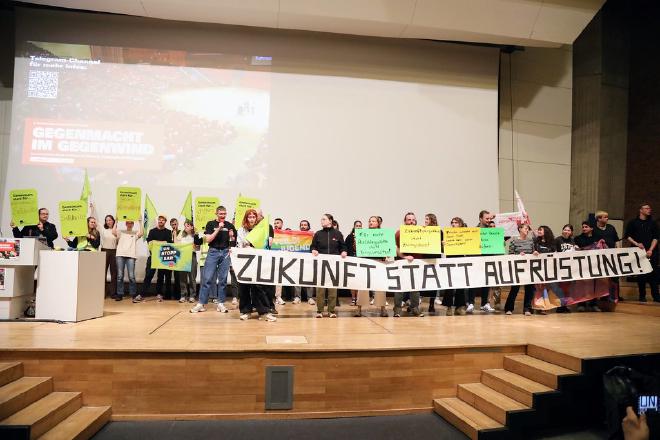 Nicht zuletzt ist es auch die Friedensfrage, die einer gewerkschaftlichen Perspektive bedarf. Die Bundesrepublik Deutschland steht gemeinsam mit ihren NATO-Partnern vor Aufrüstungseskapaden ungekannten Ausmaßes. Während die Aktionäre der Rüstungskonzerne goldenen Zeiten entgegenfiebern, bedeutet der staatliche Auftragssegen für die Werktätigen, die eigene Arbeitskraft militärischen Zwecken zur Verfügung stellen zu müssen. Die solidarische Alternative zur Friedenstüchtigkeit ist nicht still und beginnt generationenübergreifend an Lautstärke und Selbstbewusstsein zurückzugewinnen. So verdeutlichten am letzten Konferenztag Aktive der ver.di-Jugend ihre Forderung nach “Ausbildungs- statt Kriegsschauplätzen”, sowie einer gerechten “Zukunft statt Rüstung”. Hier zeigt sich einer der vielen Punkte, an denen wir als Die Linke gewerkschaftliche Kämpfe unterstützen können, vor Ort und überregional. In Arbeitskämpfen Seite an Seite mit den Kolleg:innen stehen und ihre Sorgen laut machen – auch so organisieren wir die Hoffnung zu einer solidarischen Gegemacht.